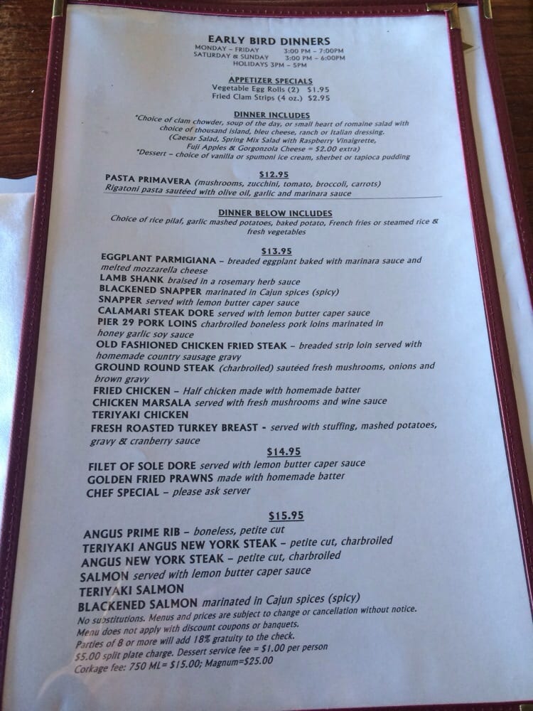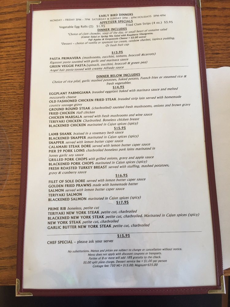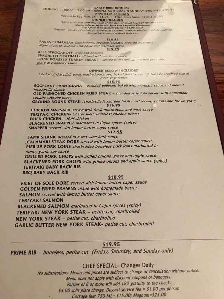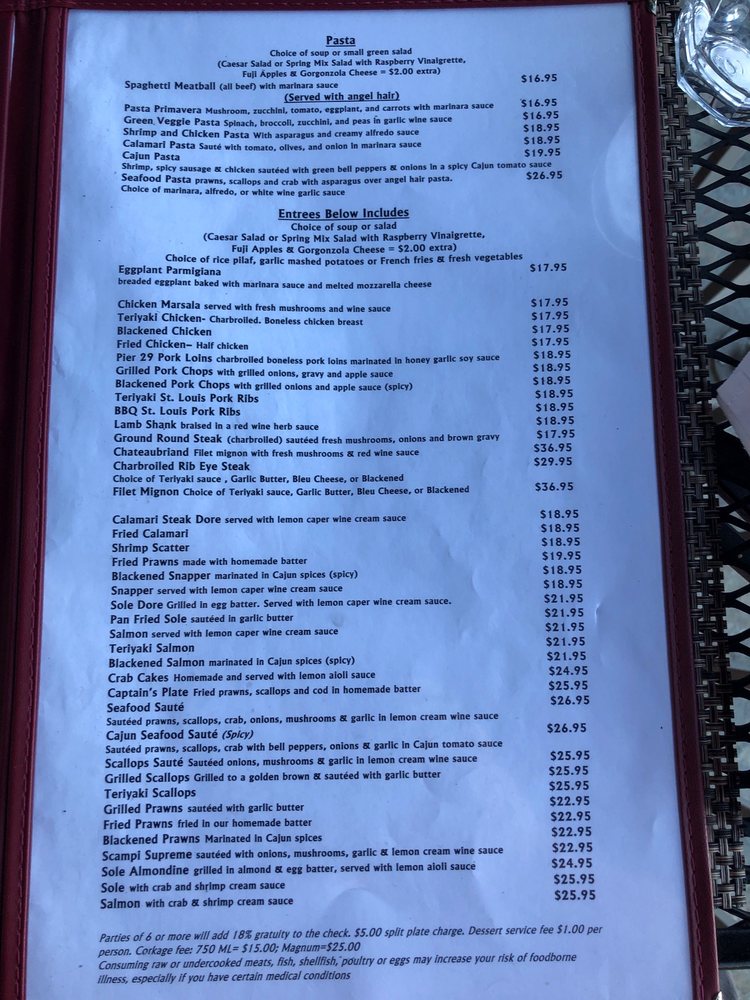 Welcome to Pier 29 Waterfront Restaurant, a hidden gem nestled between the marina and the Bay in Alameda, California. This casual yet classy dining spot specializes in seafood and steaks. The menu offers a mouthwatering selection, from crispy fish and chips to succulent shrimp, all generously portioned and expertly seasoned. Diners rave about the fresh calamari and decadent desserts like pecan pie and pot fudge sundae.